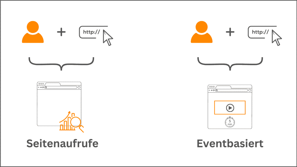Die vermutlich markanteste Änderung im GA4 ist die Art und Weise, wie Daten erfasst werden. Während bisher die Datenerfassung auf Seitenaufrufen basierte, verwendet das neue GA4 ein eventbasiertes Tracking-Modell. Dieses ermöglicht eine wesentlich granularere Analyse und erfasst diverse Aktivitäten wie Scrollen, Videowiedergaben, diverse Interaktionen mit Elementen und vieles mehr. Auch wenn es bestimmte Eigenschaften (z.B. Seitenaufrufe) im neuen GA4 nicht mehr gibt, kann man dennoch sagen, dass das neue Google Analytics definitiv präziser Daten erfasst.